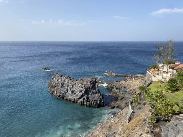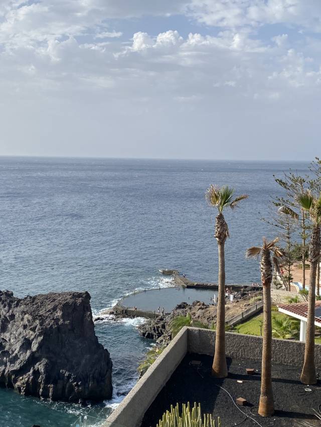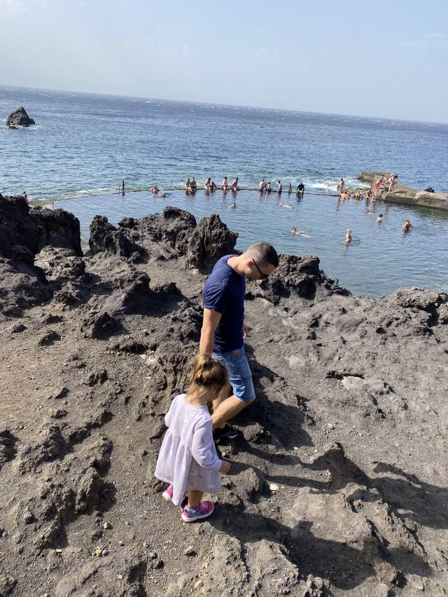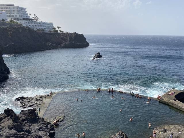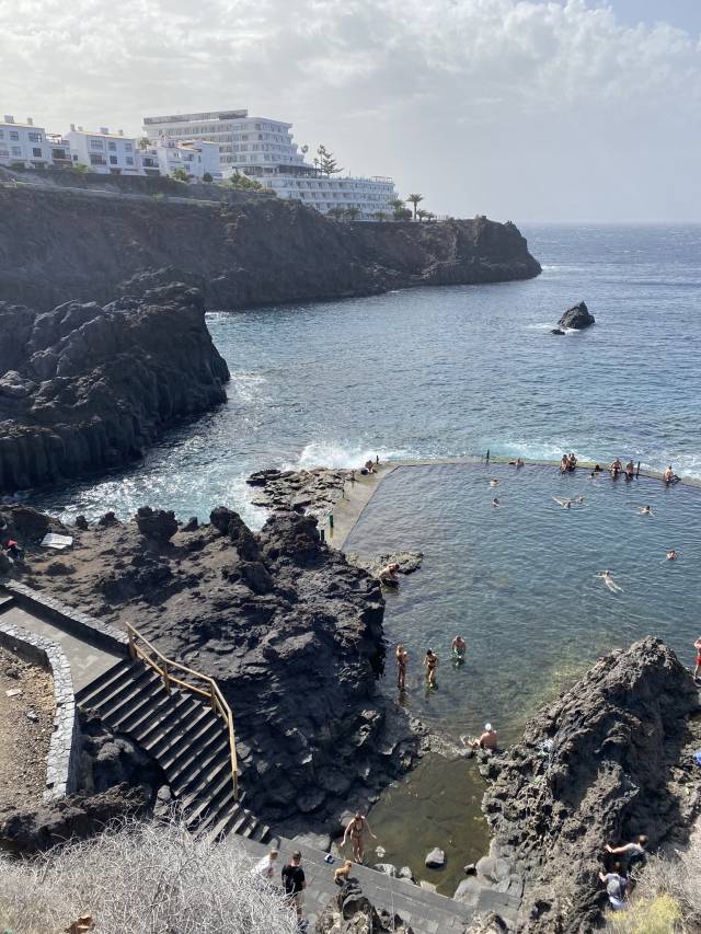 From the parking area, it was just a five-minute walk to the stunning Piscina Natural Acantilado de Los Gigantes, a natural pool formed by volcanic rock. This spot was nothing short of magical: the crystal-clear water of the pool immediately won us over. From there, we continued on foot along the coastal promenade toward Playa Puerto de Santiago.